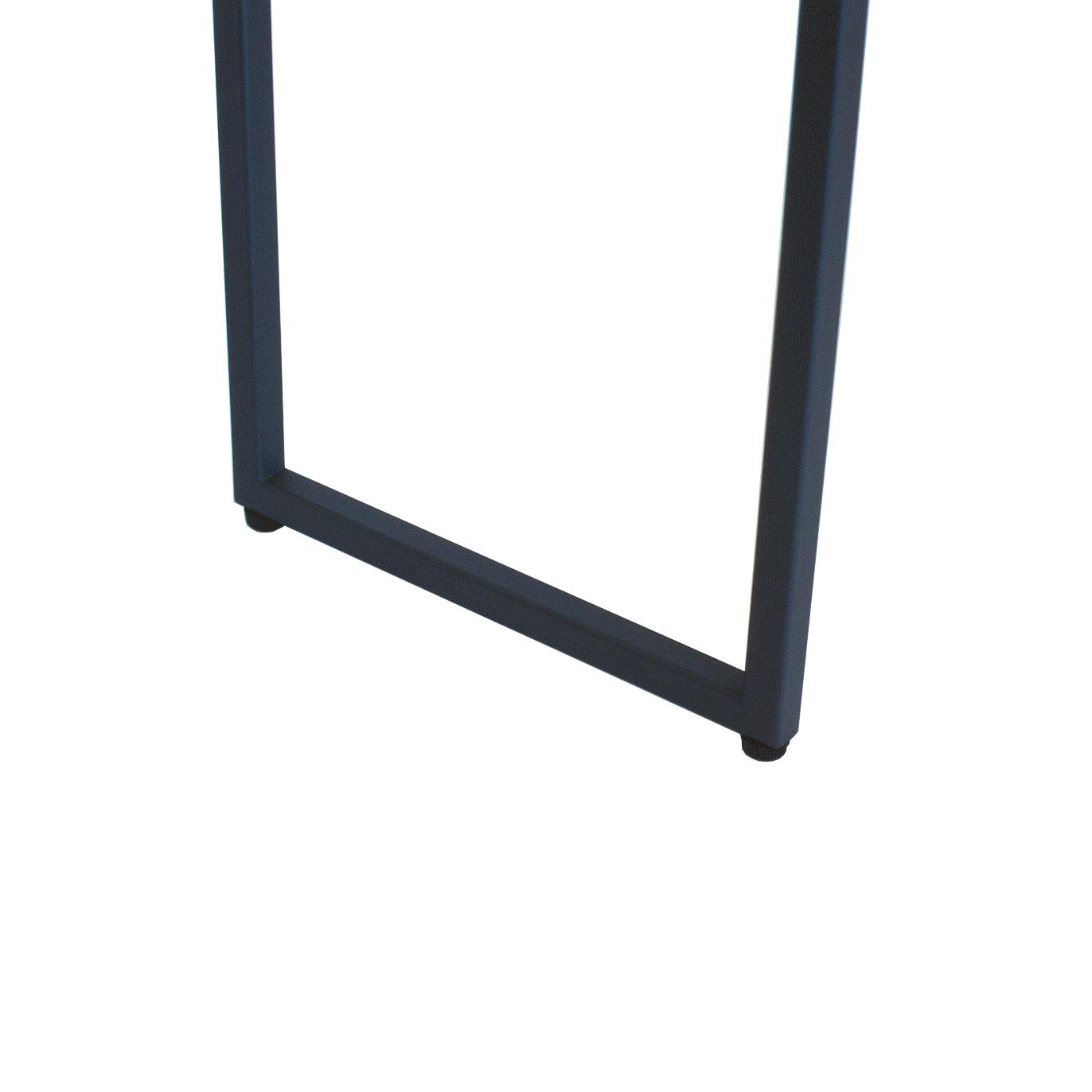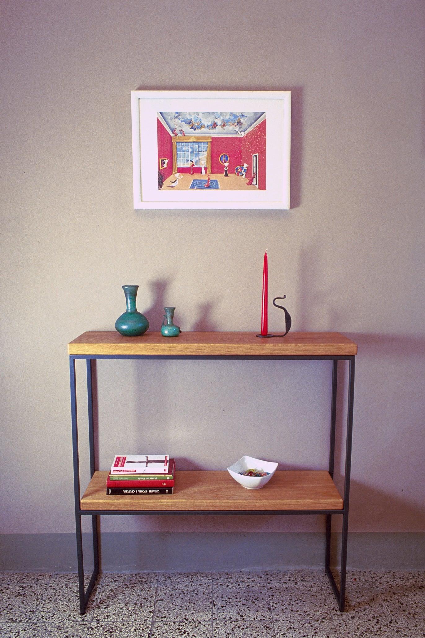 La struttura metallica, esile ma al tempo stesso molto solida, è realizzata in tubolare di acciaio a sezione quadrata di 1,5 cm ed è completamente saldata. Sono così eliminate le antiestetiche giunzioni a innesto e relative viti di bloccaggio necessarie per assemblare gli elementi che compongono la maggior parte dei mobili con struttura metallica. Le saldature sono eseguite e rifinite con la massima cura così da apparire praticamente invisibili. La consolle arriva a casa vostra pronta per essere utilizzata.