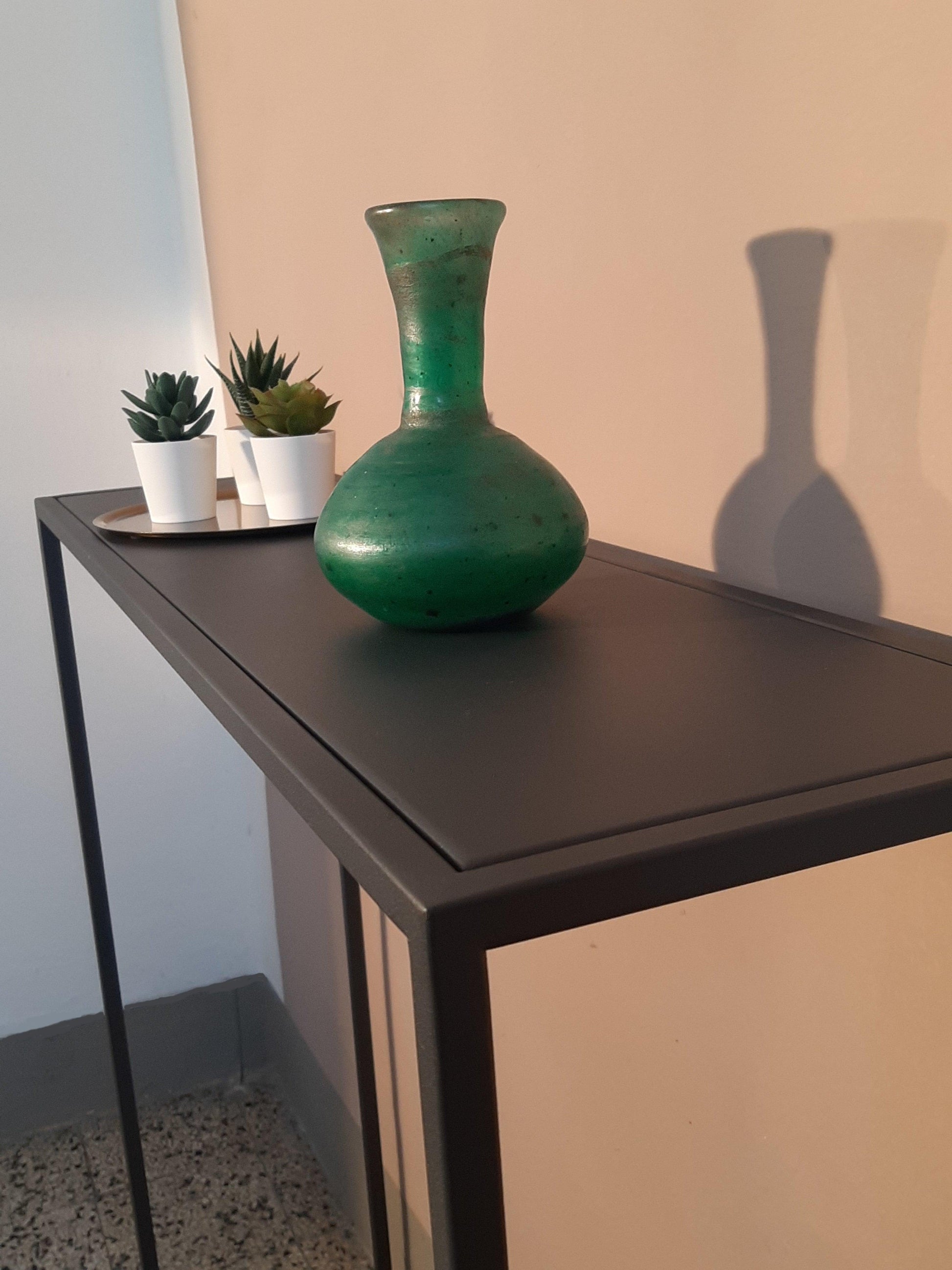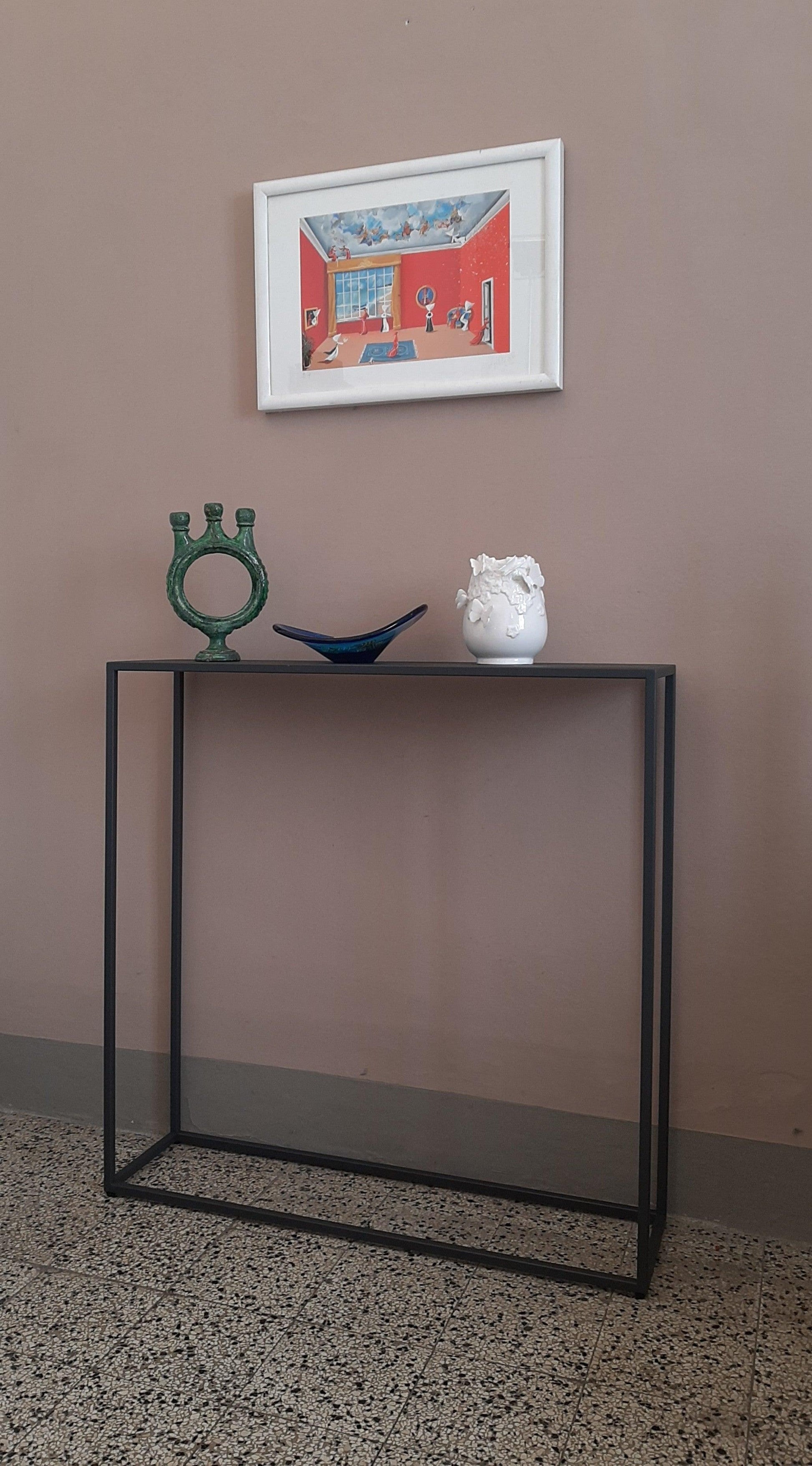 La struttura metallica, esile ma al tempo stesso molto solida, è realizzata in tubolare di acciaio a sezione quadrata di 1,5 cm ed è completamente saldata. Sono così eliminate le antiestetiche giunzioni a innesto e relative viti di bloccaggio necessarie per assemblare gli elementi che compongono la maggior parte dei mobili con struttura metallica. Le saldature sono eseguite e rifinite con la massima cura così da apparire praticamente invisibili. La consolle arriva a casa vostra pronta per essere utilizzata.